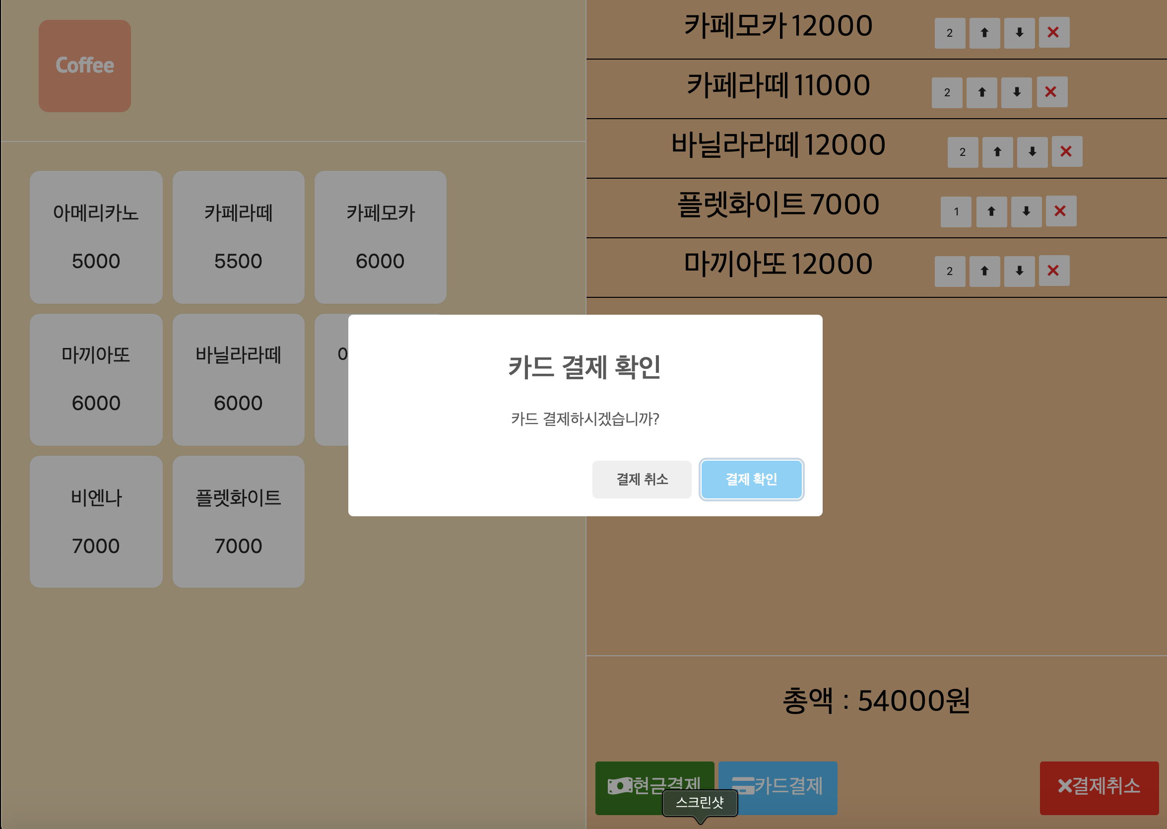 지장없이 주문창에 저장되고 4개의 버튼들 모두 정상적으로 동작한다.