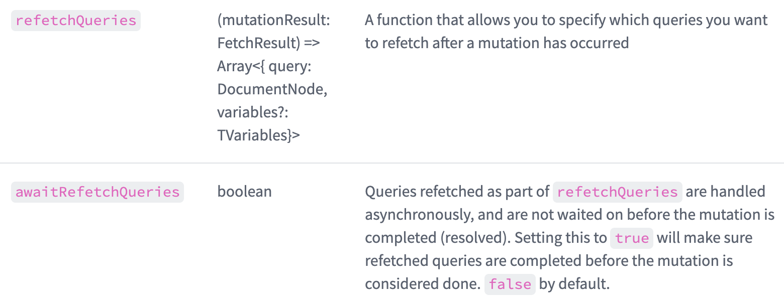 awaitRefetchQueries 의 경우 default 는 false 지만 true 로 설정하면 true 로 설정하면 mutation 요청이