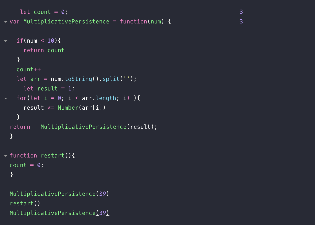 아니라면 count++, input num을 문자열로 바꾼 뒤 나눠서 각 자릿수를 곱한 값을 result 로 두고 result를 인자로 받는