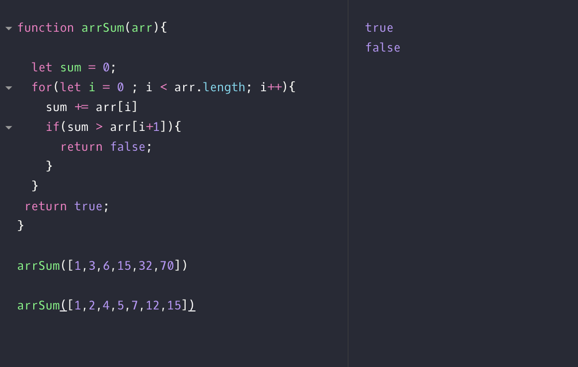 sum 이라는 누적값을 받을 변수를 설정하고 정해진 요소 전까지의 누적값과 그 다음 요소의 값을 비교해서 Boolean 값으로 리턴한다.