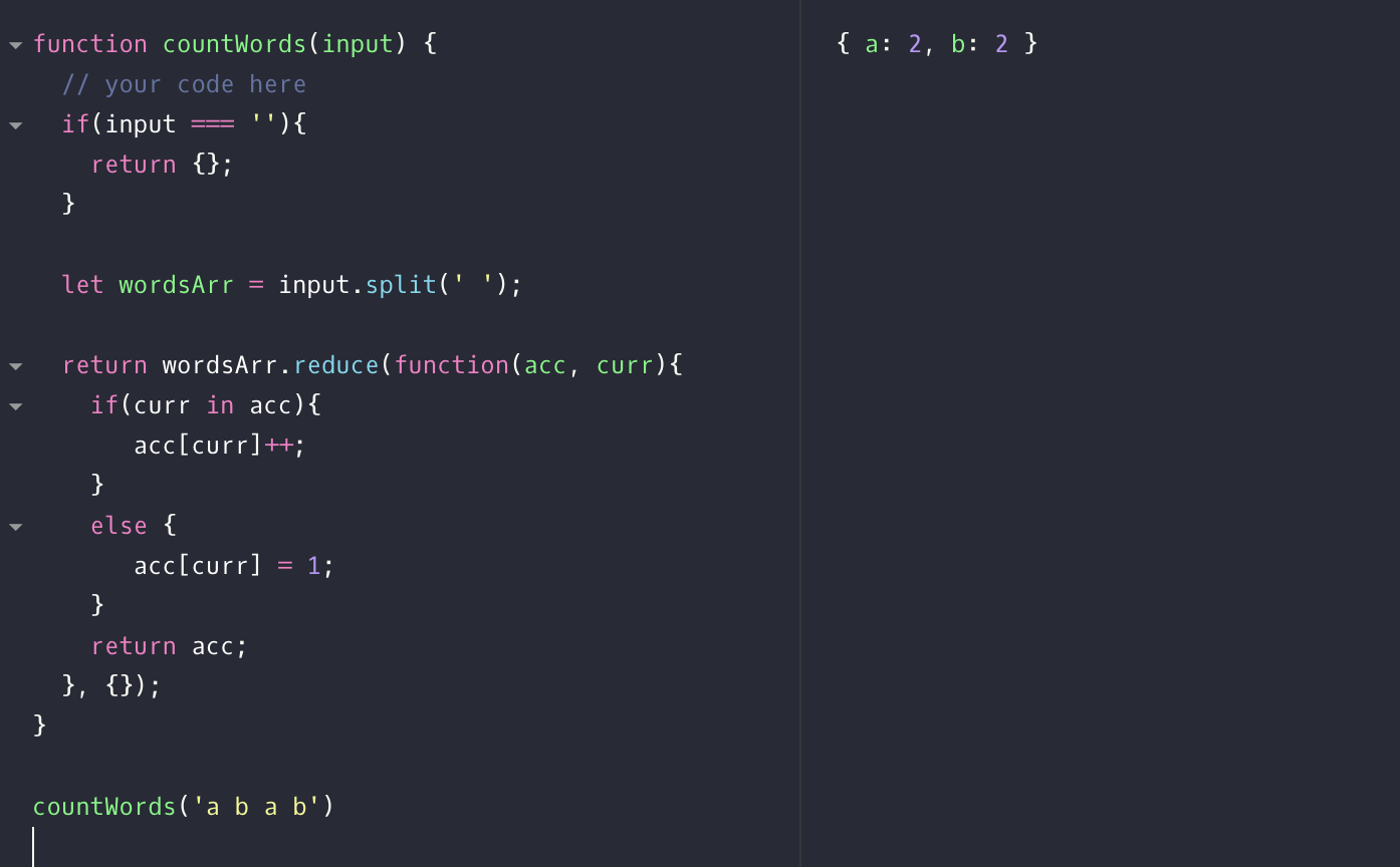 reduce 메소드의 초기값으로 빈 객체를 주고 객체(acc) 안에 curr이 키 값으로 있다면 값++ , 없다면 값을 1 로 지정.