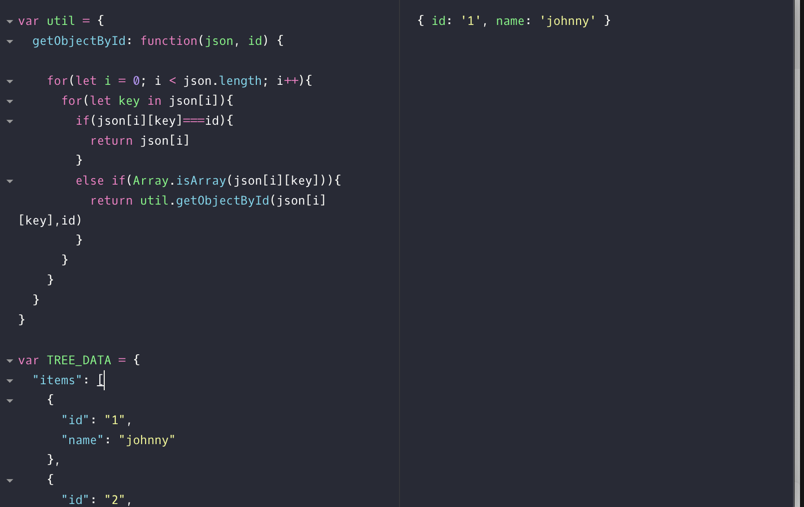 먼저 json = DATA_TREE[item] 이므로 배열. 각 배열의 요소를 for문으로 탐색해서 그 안에 객체의 값으로 id 가 있다면 요소를 리턴.