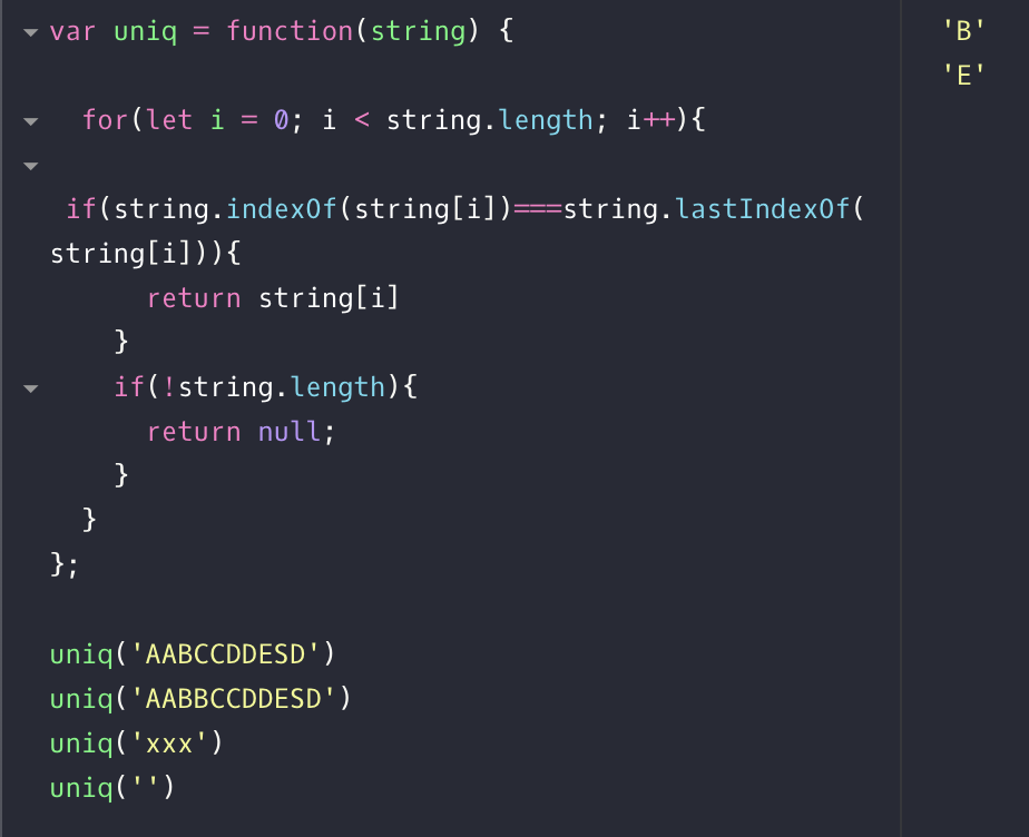 Toy 02번 문제. 문자열이 주어지면 중복되지 않는 유니크한 문자열이 있으면 리턴하고 아니면 null을 리턴.
