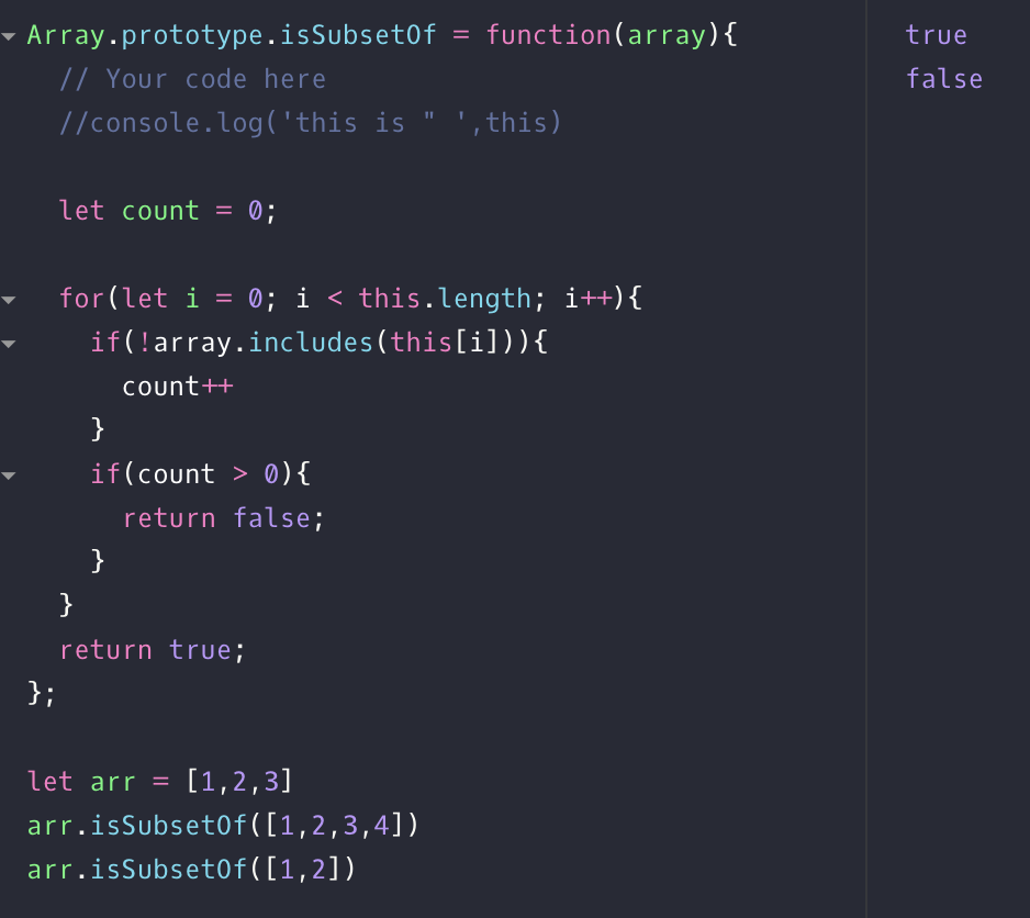 Toy 03번 문제. 배열의 메소드로 인자로 주어진 배열의 값을 전부 가지고 있으면 true , 아니면 false 를 리턴.