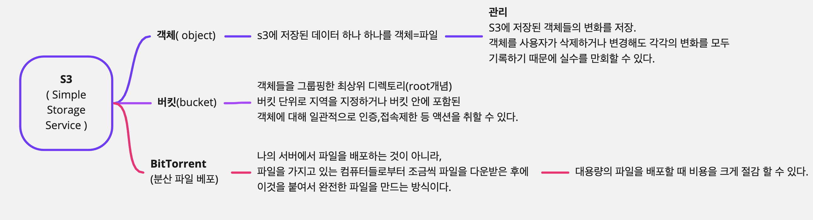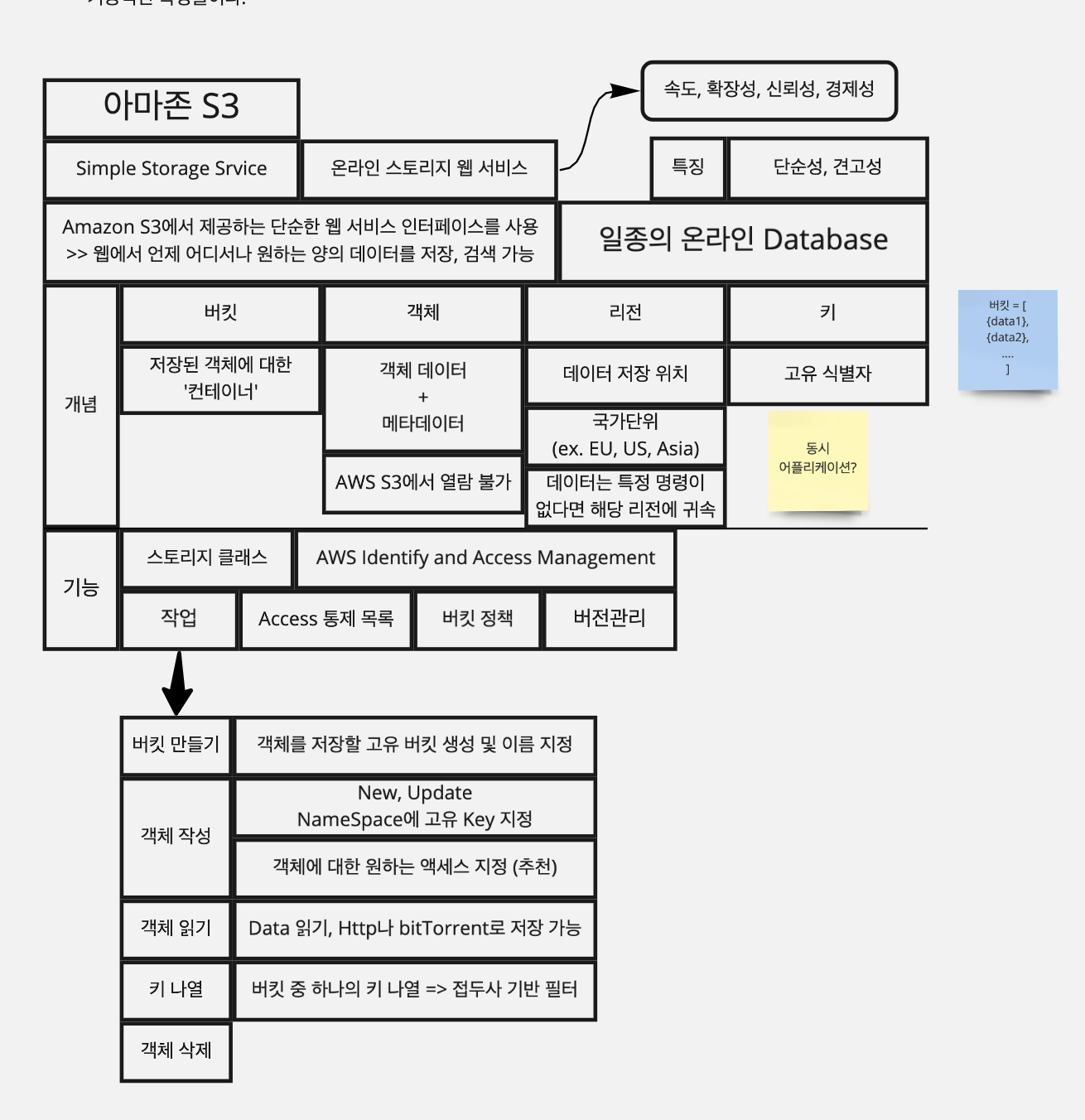 imple Storage Service의 약자로 파일 서버의 역할을 하는 서비스다. 일반적인 파일서버는 트래픽이 증가함에 따라서 장비를 증설하는 작업을 해야 하는데 S3는 이와 같은 것을 대행한다. 트래픽에 따른 시스템적인 문제는 걱정할 필요가 없어진다. 또 파일에 대한 접근 권한을 지정 할 수 있어서 서비스를 호스팅 용도로 사용하는 것을 방지 할 수 있다. 아래는 S3의 주요한 기능적인 특성들이다.