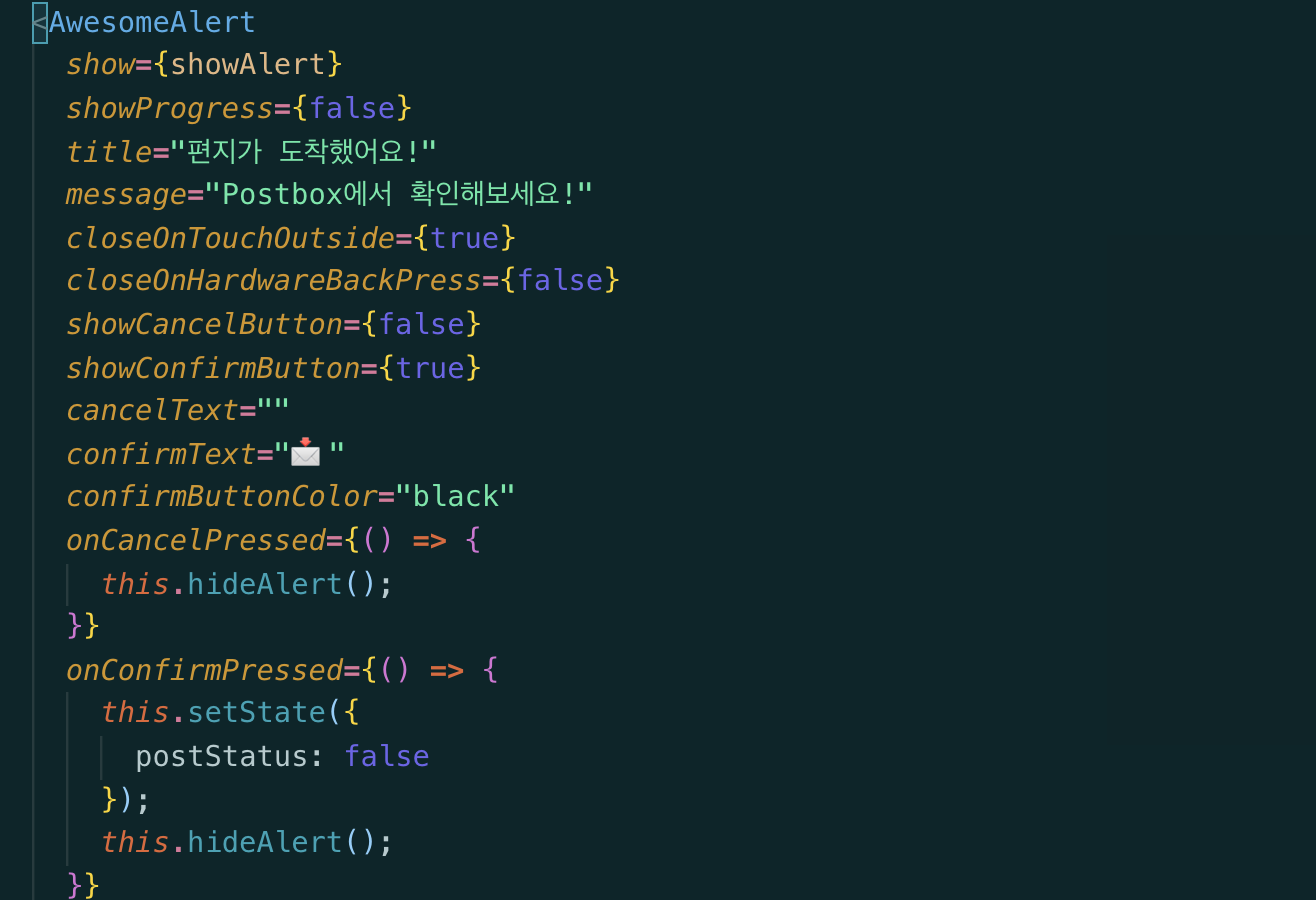 재밌던 점은 기본 component 처럼 위치하지만 Alert 에 위치한 버튼을 누를 때 state 를 변경해서 보이게 하거나 숨길 수 있게 관리한다.